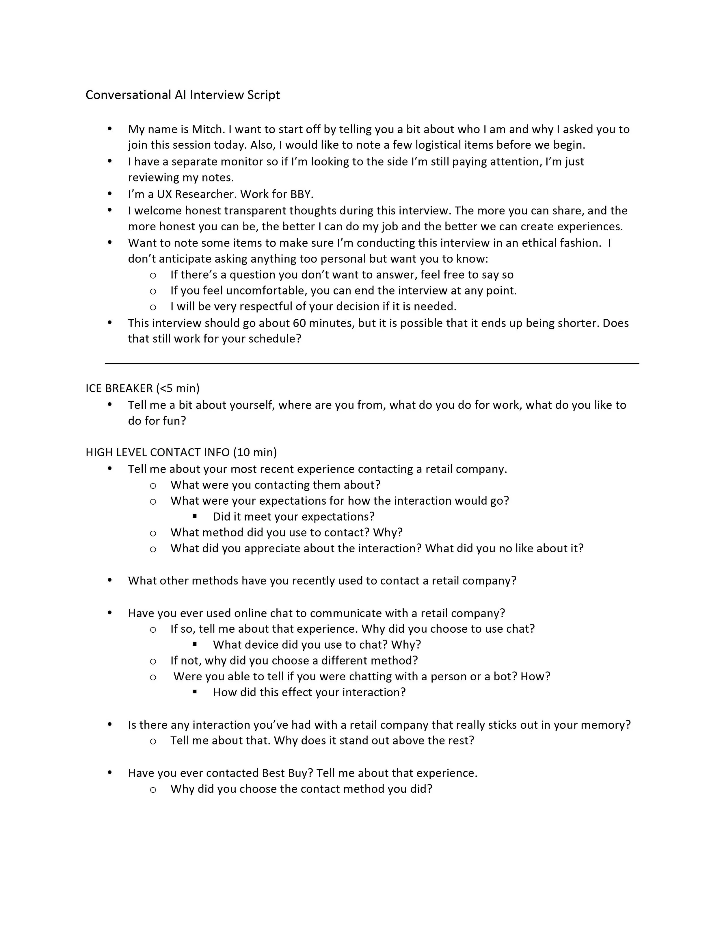 Below, you can see a portion of the interview script that I developed. When writing interview scripts, I like to use bullet points and try to flesh out the possible paths the conversation could go down. Not every question is asked in every interview, and while I make sure to guide the conversation to stay within scope, I try to make sure the participant feels in control of their own responses.